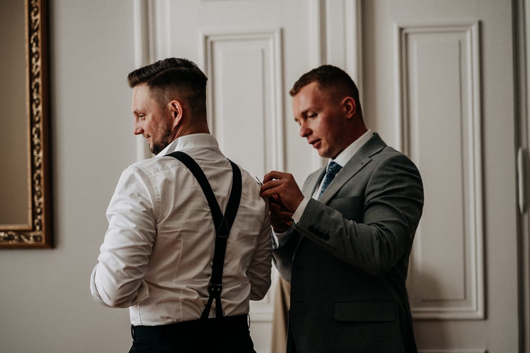 Przygotowania Patrycji i Bartka odbywały się we wnętrzach Pałacu Ksawerów. Jasne, klasyczne pomieszczenia, duże okna i naturalne światło stworzyły spokojne tło do rozpoczęcia tego dnia bez pośpiechu i zbędnego chaosu. To moment, w którym emocje dopiero się budują – rozmowy, drobne gesty, chwile ciszy i skupienia przed ceremonią.