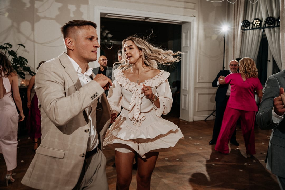 Po ceremonii wszyscy przenieśli się do wnętrz Pałacu Ksawerów, gdzie odbyło się wesele. To przestrzeń, która łączy elegancję z lekkością, gdzie klasyczne wnętrza nie przytłaczają, a jednocześnie nadają całości wyjątkowy charakter. Wesele Patrycji i Bartka miało bardzo naturalny przebieg. Było dużo rozmów, śmiechu i spontanicznych momentów. Bez presji idealnych kadrów, bez sztucznego pozowania. No i trzeba również wspomnieć o zabawie, która dzięki dobrej muzyce, wspaniałym gościom jak nowożeńcom, była pełna prawdziwej energii i spontanicznych zachowań. Dzięki temu reportaż zachował autentyczność, a zdjęcia i film ślubny oddają prawdziwy klimat tego dnia.